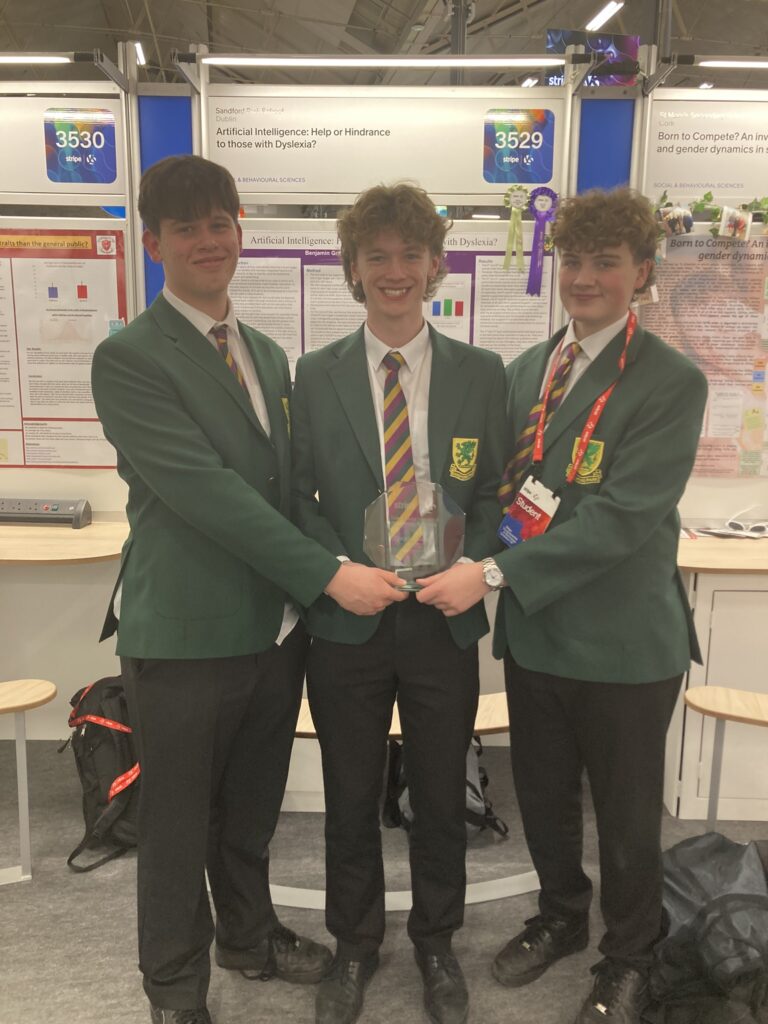 Benjamin Griffiths, Alfie Stephenson, and Sam Colleary competed in the Stripe Young Scientist and Technology Exhibition. Their project was titled ‘Artificial Intelligence: Help or Hindrance to those with Dyslexia?’ and investigated whether people affected by dyslexia perform better in school when aided by artificial intelligence or when aided by a teacher. They performed very well and got a ‘Highly Commended’ in the Intermediate Social & Behavioural Sciences category and a special prize from the Atlantic Technological University. Well done!
